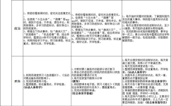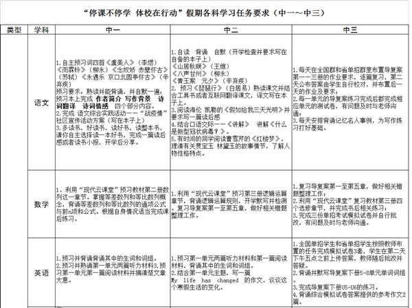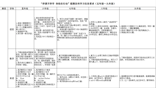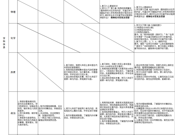 詳見EXCEL表(點(diǎn)擊“停課不停訓(xùn) 學(xué)科任務(wù)布置匯總表”即可下載查看表格原件)
